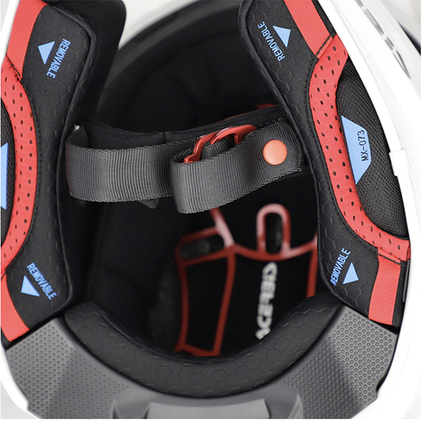 L’A.C.S. (Acerbis Comfort System) migliora la vestibilità e il flusso d’aria interno, mentre i guanciali sono dotati di un nuovo sistema di sgancio rapido, facilmente identificabile dai loghi in silicone.