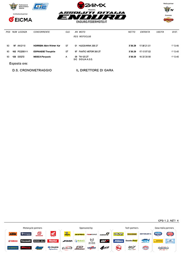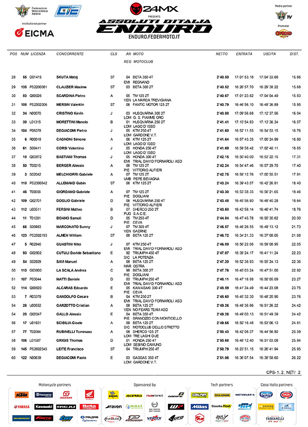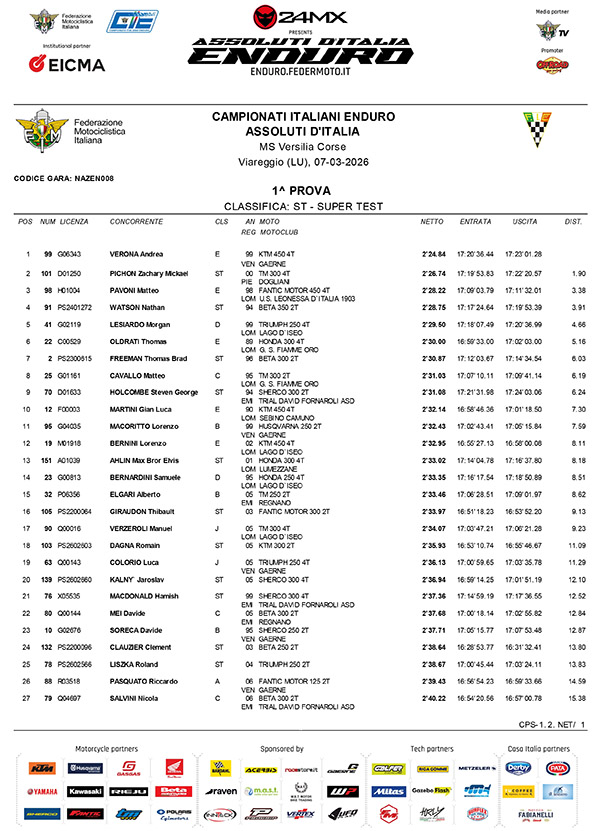 Al debutto al debutto con la KTM 450 4T Verona ha preceduto Zach Pichon (TM-Boano 300 4T) di quasi 2 secondi, mentre Matteo Pavoni anch’esso al debutto con la Fantic 450 4T è finito terzo a 3.38.