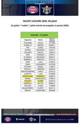 “Il progetto Pata Talenti Azzurri è uno dei nostri fiori all’occhiello, la punta dell’iceberg del più ampio impegno da parte nostra per lo sviluppo della base e la ricerca dei profili più promettenti. Il lavoro portato avanti con i Talenti Azzurri è un’attività consolidata, che si rafforza anno dopo anno e che ha contribuito e contribuisce a rendere i nostri ragazzi capaci di imporsi sia a livello nazionale che internazionale. Essere riusciti a coinvolgere anche quest’anno un numero così alto di piloti, garantendo loro un supporto di qualità, è una sfida che siamo orgogliosi di portare avanti. Ringrazio Pata e Macron per il prezioso supporto che ci danno. Un grande grazie va anche ai nostri Tecnici, alle famiglie dei piloti e ai piloti stessi. Grazie all’impegno di tutti è possibile garantire un futuro roseo al nostro sport”.