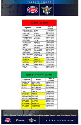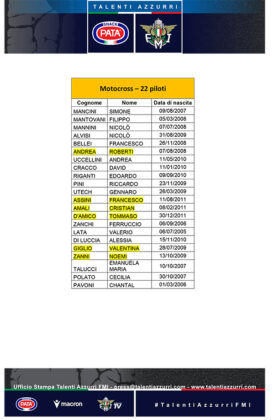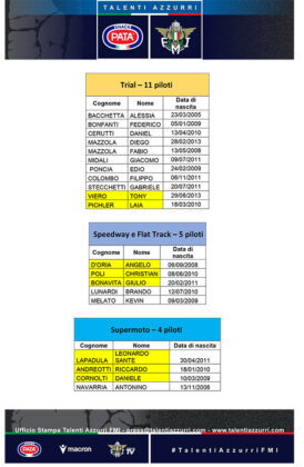I campioni di domani, ovvero i Pata Talenti Azzurri. Il progetto di vertice della Federazione Motociclistica Italiana per la ricerca del talento si rinnova anche nel 2026 sempre con lo stesso spirito: supportare i piloti più promettenti del panorama nazionale e dare loro la possibilità di crescere dal punto di vista umano, professionale e tecnico. 89 i ragazzi coinvolti, provenienti dalle diverse discipline del motociclismo: Motocross, Supermoto, Velocità, Motorally, Quad, Trial, Enduro, Speedway e Flat Track. Anche nel 2026, i ragazzi selezionati dal Settore Tecnico FMI saranno impegnati in un programma annuale che vedrà diversi appuntamenti in cui si lavorerà sulla tecnica e sulla parte atletica. Appuntamenti che si svolgeranno sia nella off season che durante la stagione. Tutto per un progetto, quello dei Pata Talenti Azzurri FMI, che in passato ha coinvolto, tra gli altri e con modalità differenti, piloti come Francesco Bagnaia, Marco Bezzecchi, Fabio Di Giannantonio nella velocità o Andrea Adamo, Andrea Verona, Mattia Guadagnini, Andrea Sofia Rabino nel fuoristrada. E che anche in questa stagione vedrà il supporto di prestigiosi partner come Pata Snack, title sponsor del progetto, e Macron, che fornirà l’abbigliamento per gli atleti.
