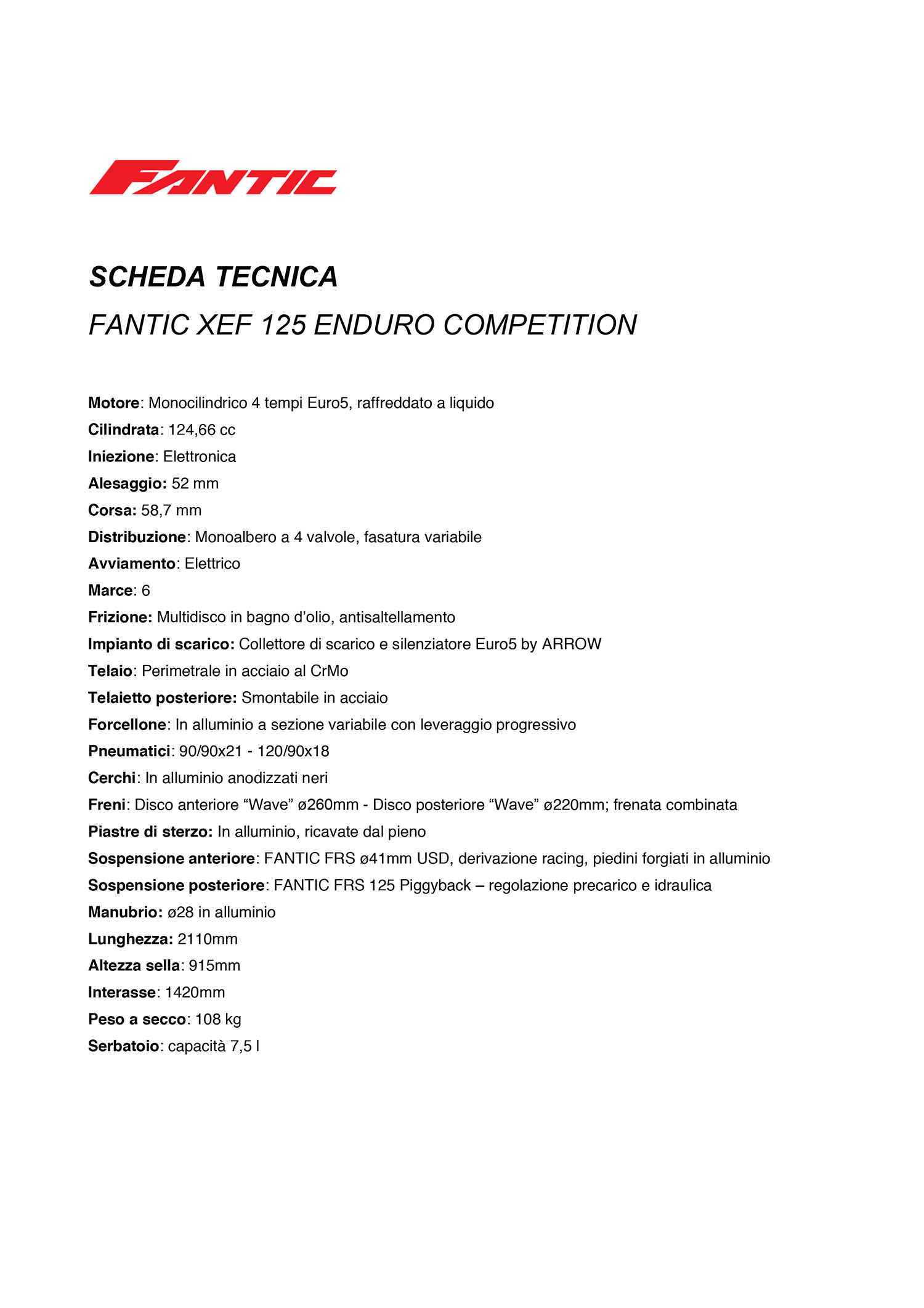 SCHEDA TECNICA FANTIC XEF 125 ENDURO COMPETITION