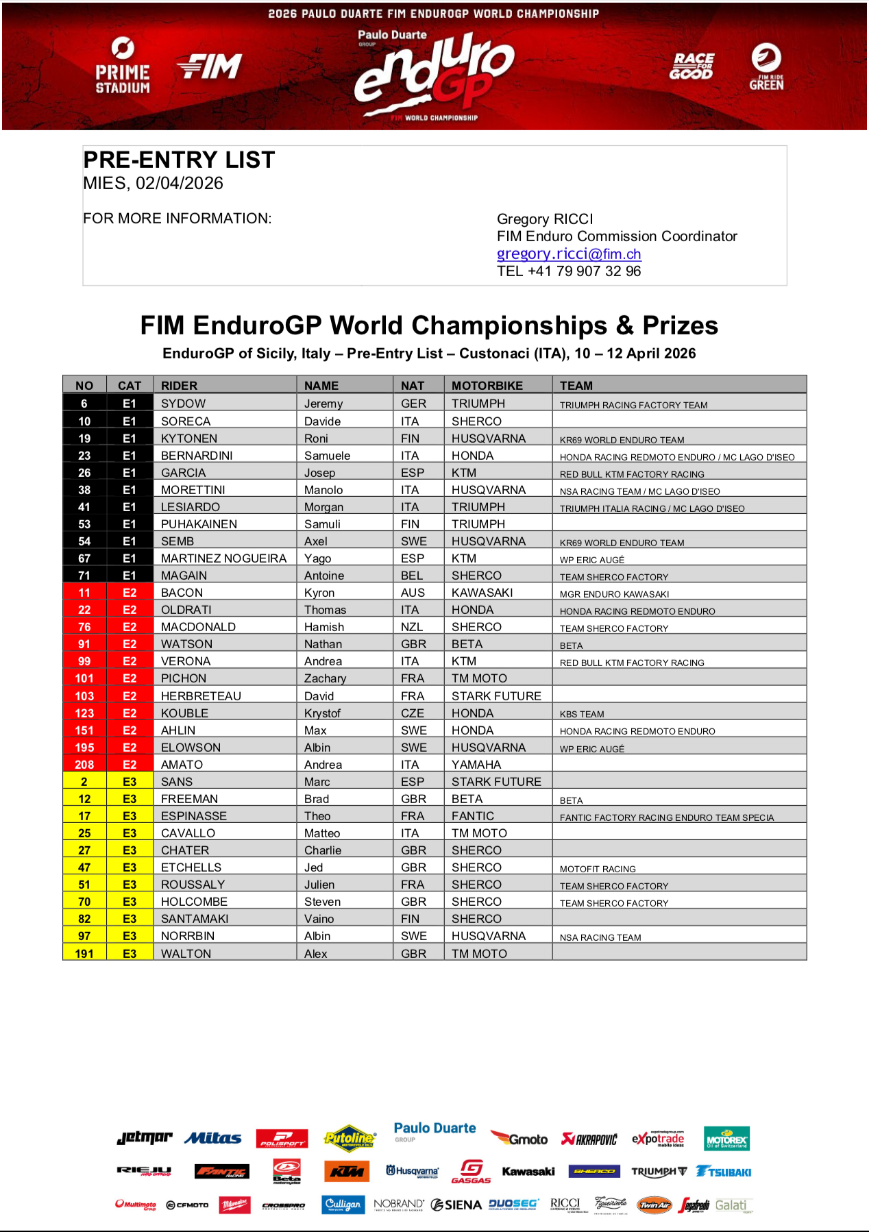 È stata confermata la lista dei pre-iscritti per la prima tappa del Campionato del Mondo EnduroGP FIM Paulo Duarte 2026 in Sicilia, Italia, dal 10 al 12 aprile.