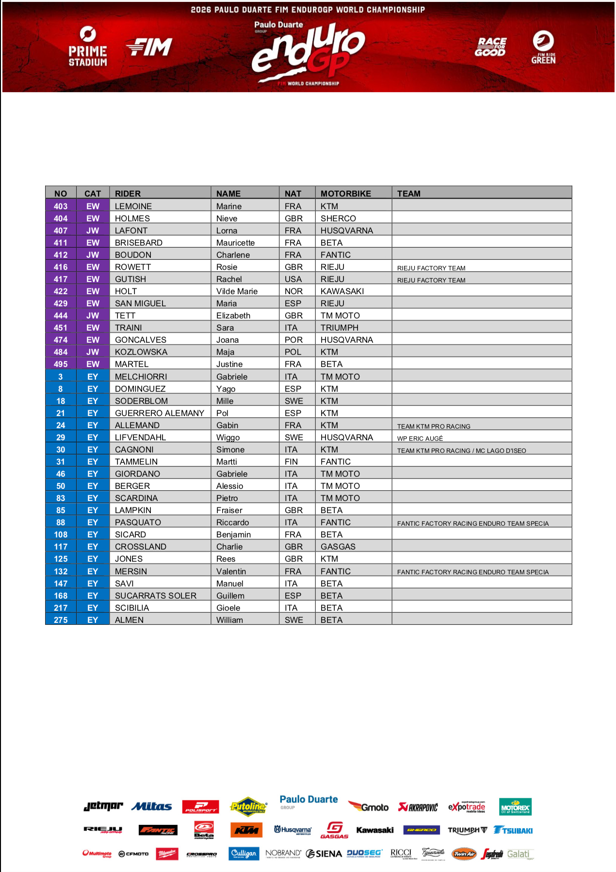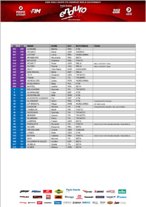Nella categoria regina dell’EnduroGP gareggeranno 33 piloti, 13 dei quali vantano ben 45 titoli mondiali complessivi. Saranno inoltre rappresentati 11 costruttori, tra cui, per la prima volta, Stark Future, azienda leader nel settore dei veicoli elettrici (EPV).
